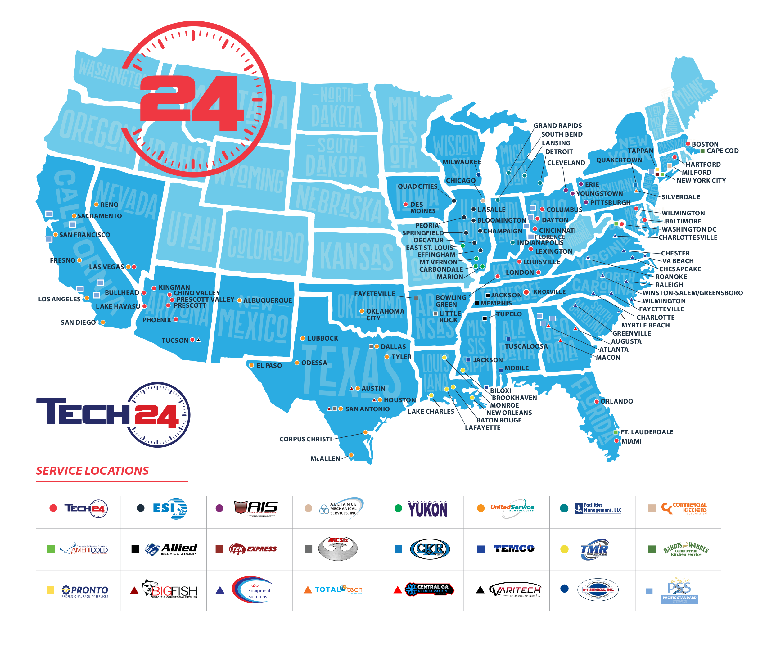 For more than 40 years, Tech24 has been committed to providing the ultimate service experience, and that commitment continues as we expand our reach across the country. By building an all-star team through hiring the best technicians, building relationships with select service partners and growing our family of Tech24-owned companies, we are proud to deliver the superior service our customers have come to expect, nationwide.